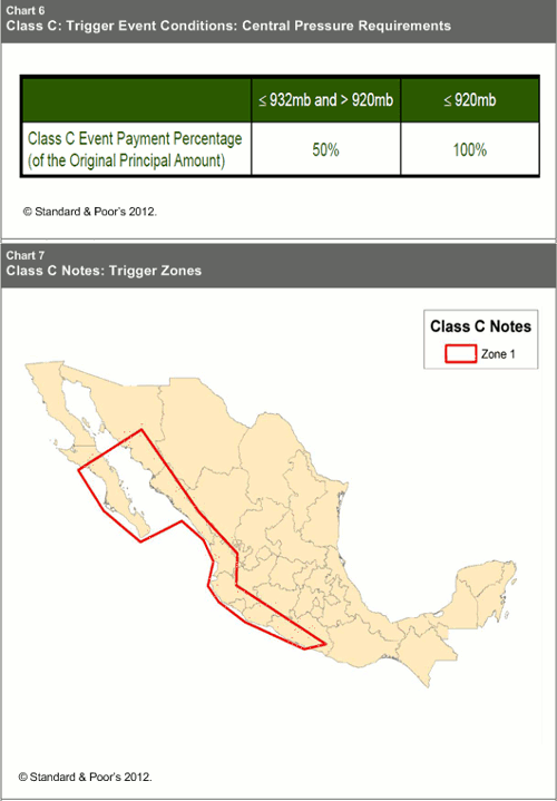For the $140m earthquake exposed Class A notes, there are five earthquake zones where the epicentre of a qualifying earthquake must be and both the magnitude and depth of any earthquakes will also be used in the parametric trigger. The coverage area is larger than in the 2009 transaction, which only had three earthquake zones, with two new zones in the north of Mexico. You can see the factors which will denote a trigger event and the five earthquake zones for the Class A notes below (taken from the S&P presale documentation). The parametric trigger for earthquake is much more detailed than in the 2009 transaction, where earthquake depth was the same for each zone, although the magnitude parameters did differ.