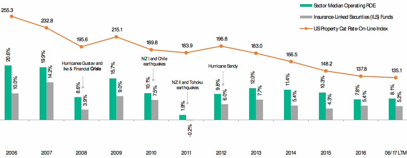 The chart above from rating agency Moody’s shows the steady decline in reinsurance pricing and the equally steady decline in reinsurer median operating return on equity (RoE), against the average return of ILS funds.