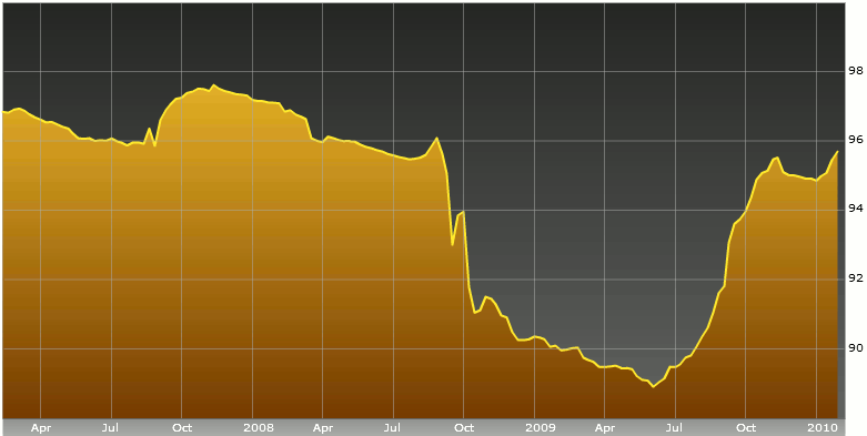 The Swiss Re Cat Bond Price Return Index, tracking the price return for all outstanding USD denominated cat bonds (which you can quote and chart through Bloomberg here), has recovered from its slight dip at the end of 2009 and has climbed a few points since then.