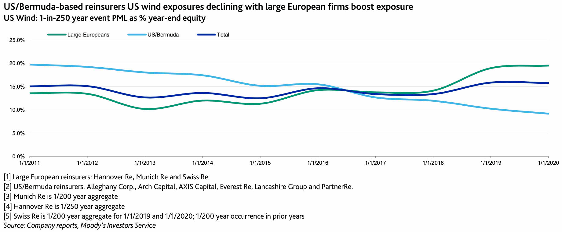 The U.S. and Bermudian reinsurance firms have in some cases significantly reduced their catastrophe PML’s, even despite the much better pricing available at the renewals in 2020, Moody’s notes.
