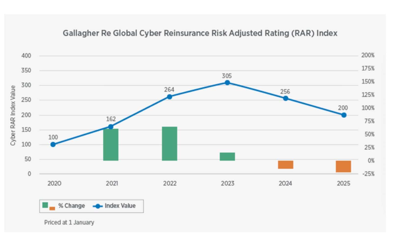 As mentioned, the Cyber RAR Index was 100% higher on January 1st 2025, compared to January 1st 2020, however it was 34% lower than its peak on January 1st 2023.