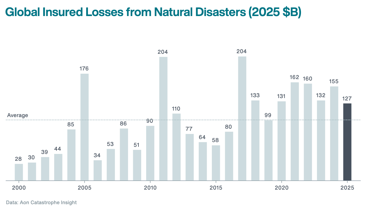 According to insurance and reinsurance broking group Aon, global insured losses from natural disaster events in 2025 reached $127 billion, marking the sixth consecutive year that insurance payouts have exceeded the $100 billion threshold.