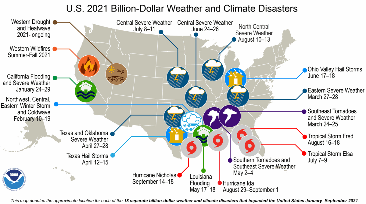 2021 is also the record seventh-consecutive year where the United States has experienced 10 or more billion-dollar disasters from weather and climate related events.